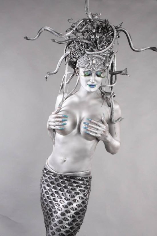 poses near naked in gold body paint March